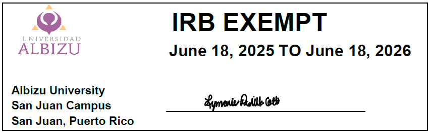 De tener alguna duda con el estudio puede comunicarse con Dr. Adam Rosario Rodríguez al número telefónico (787) 725-6500, ext. 1586 o a su correo electrónico [email protected]. De tener alguna pregunta o duda con relación a los aspectos éticos de este estudio se puede comunicar con la Dra. Lymaries Padilla, Administradora del Comité para la Ética en Investigación de la Universidad Albizu, a través de su correo electrónico [email protected] o el número telefónico (787) 725-6500, ext. 1123.